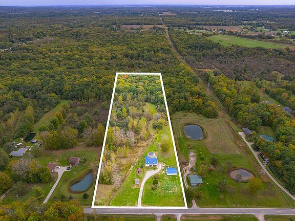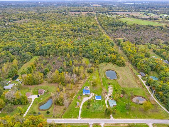 On 10.5 acres of breathtaking landscape sits this custom-built home. The flowing open-concept design encompasses three bedrooms, two full bathrooms, and a versatile office space suitable for various purposes. Cathedral ceilings and bay window offer the living room natural light and comfort. The master suite features a spacious walk-in closet and en-suite bathroom. The unfinished basement offers boundless opportunities for expansion with large windows for natural light, while the expansive back deck provides a picturesque backdrop for entertainment or tranquil evenings. The residence and accompanying 30x40 pole barn have been equipped with a newer metal roof. This property's outdoor space includes a swimming pool, complete with its own deck and scenic wooded trails. Close to I94 and 69