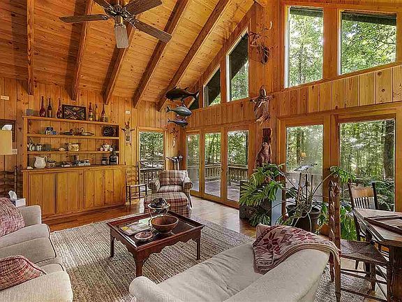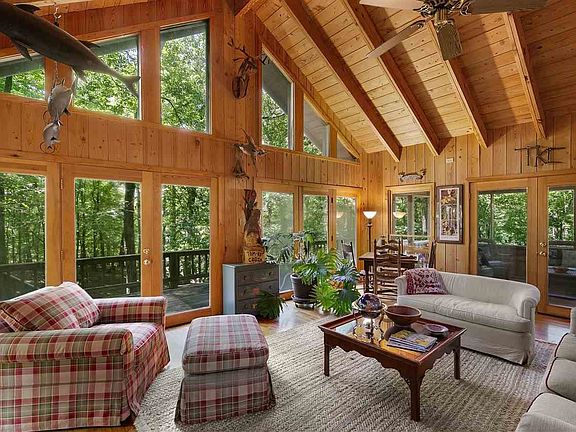 Located in the heart of Old Pickwick is this charming cabin surrounded by mature trees and just steps to its private boat house in Yellow Creek. The cabin includes a vaulted great room with wood ceilings, 3 bedroom, 2 baths, and a bonus/bunk room down stairs. A vaulted screen porch with large deck overlooking the wooded terrain and cove. A double boat house with swim deck and ski boat lift is just steps below in a protected cove in Yellow Creek.