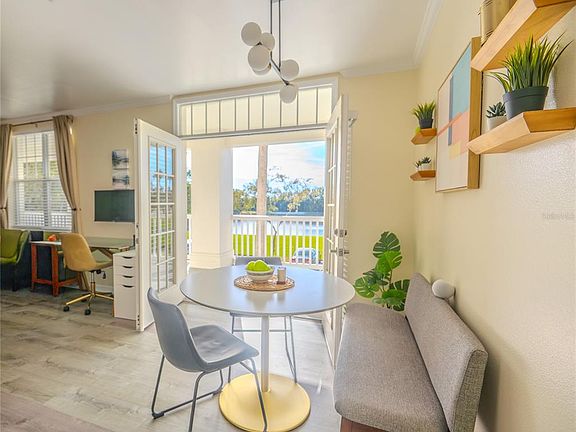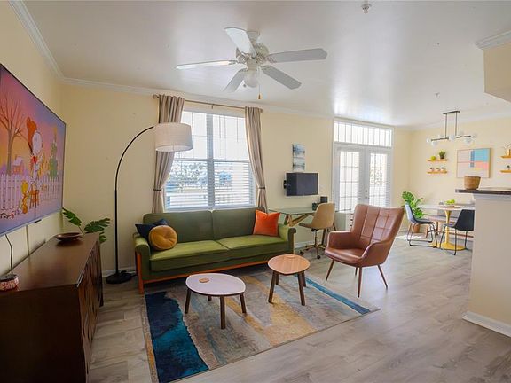 Enjoy beautiful water and conservation views right from your living room’s front windows and French door! This charming 1-bedroom, 1-bath condo provides a bright, open living space enhanced with luxury vinyl flooring and elegant crown molding in the living and dining areas. The French doors open to the outdoors, allowing you to truly bring nature inside. This spacious bedroom features a generous walk-in closet, and the home includes a dedicated laundry room with a full-size washer and dryer stacked to give more space. Additional upgrades include new fitted blinds (2023) and a new toilet (2024). The Siena community provides fantastic amenities, including a clubhouse, community pool, fitness center, and playground. Plus, residents also enjoy Celebration’s incredible additional residential amenities—five additional pools, tennis, basketball and sand volleyball courts, 26 miles of scenic walking and biking trails, and an array of shops, restaurants, banks, and salons. Perfectly located in the heart of Celebration, you’ll have easy access to Walt Disney World and Orlando International Airport. And great news—condo fees will be reduced in 2026 (see Realtor Remarks).
