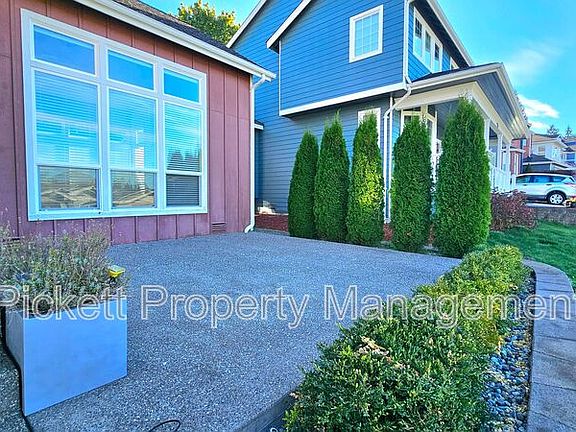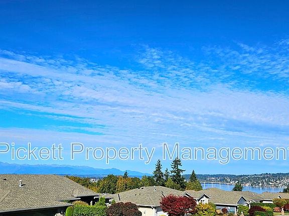 This 4 bedroom, 3 bathroom home has the perfect view to watch Bridge Blast from the Manette Bridge! Spacious main floor with an open concept between the kitchen, living room, and dining room. Living room features a high vaulted ceiling with a gas log fireplace and tall windows that bring in lots of natural light. The kitchen features all major appliances, including a gas range and countertop ice maker (the ice maker in the fridge is not operational). The main floor also offers a bedroom and a full bathroom. The laundry room is also downstairs with a deep sink, cabinets, and washer/dryer hook-ups. Three bedrooms and two full baths are located upstairs, including the large master suite, which features views of the Olympic Mountains, Sinclair Inlet, and Manette Bridge, a spacious bathroom with a large soaking tub and walk-in shower, and a large walk-in closet. Spacious two-car garage with extra space for a workbench or additional storage. Fully fenced backyard. Cats are possible with approved third-party pet screening, $500 additional security deposit, and $35 monthly pet rent, both per pet.