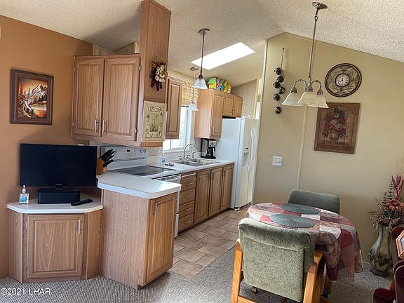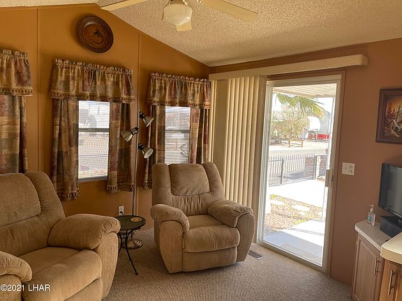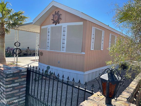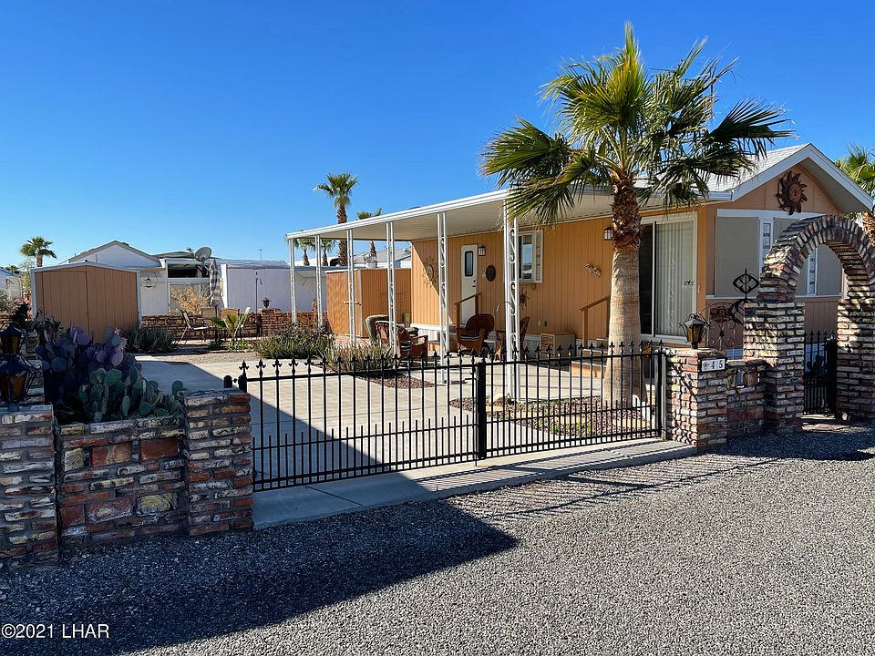 Welcome to this Southwestern style home in the Lovely Mountain View Resort, Co-op. This home is beautifully furnished and includes nice, well maintained, appliances for your convenience. Beautiful Ceramic tile in the kitchen, hallway and bathroom. Sit back and relax under a comfortably furnished outdoor patio with an awning cover. Enjoy the beautiful cactus garden landscape and the tropical palm tree beautifully placed at the front entrance. Mexican brick fence surrounds the property with 3 wrought iron gates incorporated in the front and 1 wrought iron gate in the back. The property includes 2 extra buildings, a workshop and a craft shop where the dryer is located. There is a clothes line located behind the shop as well, everything is easily accessed from the backdoor of the home where the washer is located. There is a nice concrete driveway and extra room for possibly a boat, ATV's, jet ski's etc... And while we're here, I'll add that you are conveniently less than 20 miles from the mighty and beautiful Colorado River.