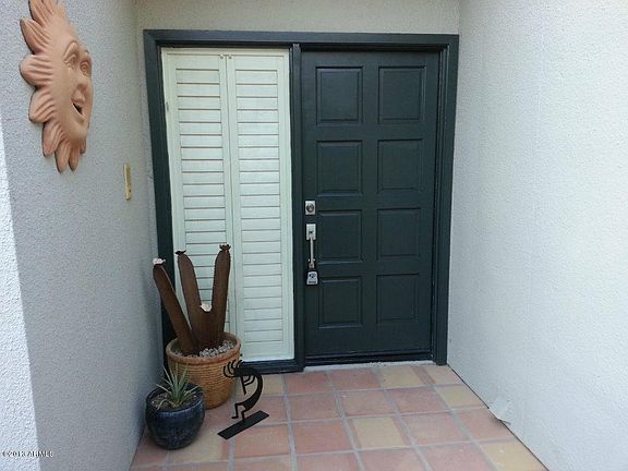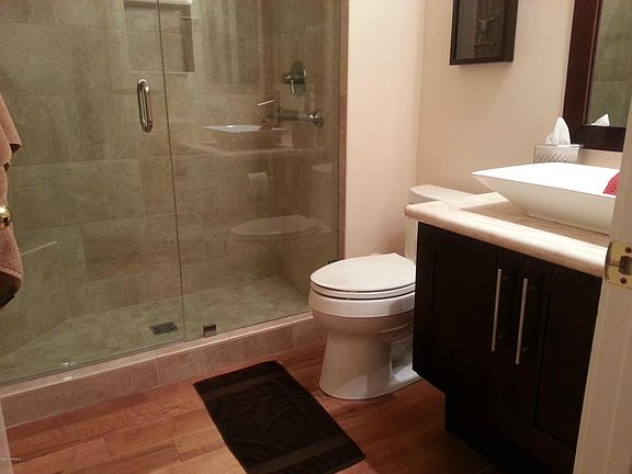 This unit has been remodeled top to bottom, and has only the finest in finishes. To name a few, guest bath has walk in glass shower with bench, floating vanity with vessel sink. Master bath is done in travertine with double sinks, extended glass shower with bench, large oval travertine undermounted tub, and custom-built barn door in solid alder between master bedroom and bathroom. Kitchen features all new stainless appliances, flat top stove , French door refrigerator, under counter wine beverage refrigerator, shaker style dark birch cabinets, and beautiful granite counter tops. There is even a small breakfast area. Kitchen entry, guest bath, dining room and traffic areas are scraped pecan wood floors. Living room features new custom 14 foot distressed wood mantle on floor to ceiling stucco fireplace. Front and back courtyards were redone in tumbled travertine and professionally landscaped.
