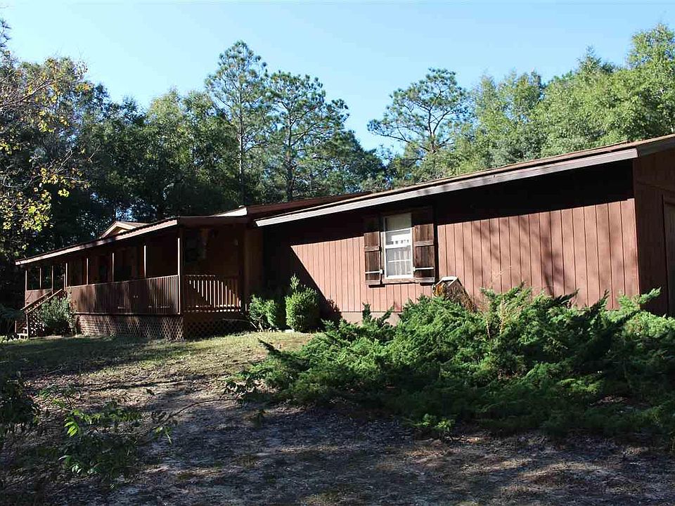If you are looking for a great home with acreage, you have found it! This 3bd/2ba manufactured home is located on almost 6 acres of property and comes with an attached 2 car garage as well as a detached workshop. This property is very private and secluded with a private drive leading you to the home. The beautiful covered front porch that spans the length of the home is the perfect place to sit in your rocking chair while relaxing and watching the wildlife. Inside you will find an open split floor plan with a large living room, vaulted ceiling accented with a wooden beam, a corner wood burning fireplace for those cold winter nights and a formal dining area. The Kitchen comes complete with a breakfast bar and all appliances including the refrigerator. All 3 bedrooms are spacious and offer plenty of room for your furniture. There is an indoor laundry room off the kitchen with storage and easy access to the attached two car garage.The garage has an electric garage door opener and a side entry door. The home comes with gutters and built in hurricane protection shutters for all windows. There is a 22 x 16.5 detached workshop with a bathroom as well as a storage shed attached to the workshop, separate metal storage shed and a green house. This property has so much to offer. Call today and make it your new home tomorrow.