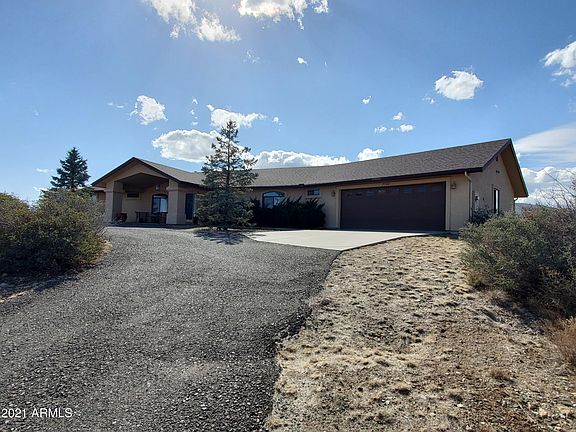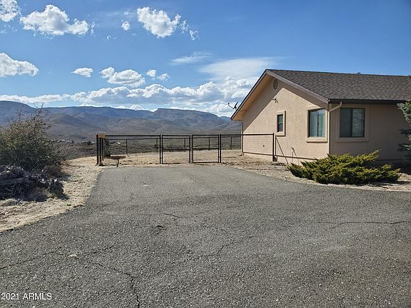 VIEWS, VIEWS, VIEWS!!!! 360 degrees of VIEWS!! Now is your chance to own this amazing just under 6 acre property with a beautiful 2150 square foot custom home! Sit on your new back patio and watch the amazing storms up in the Bradshaw Mnts. The views will not disappoint! Inside this beauty, there are 3 bedrooms & 3 full baths, large gorgeous kitchen, granite covered island with seating for 3. in addition, the home has vaulted ceilings, plant shelves, rounded corners, custom lighting, separate tub/shower with a jetted tub, huge walk in closet, sliding master door to the patio, 4 panel doors, custom kitchen cabinets, massive utility room, formal dining room, surround sound everywhere inc garage & covered patio, RV gate, pipe fencing, and more. This home is perfect and awaits for a new owner!