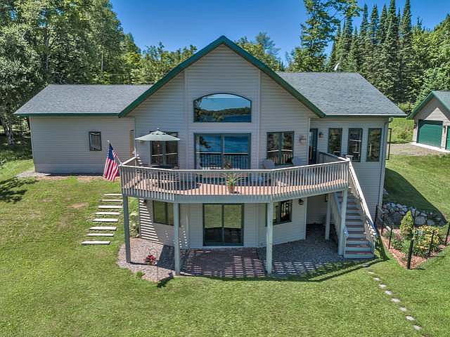 Lovely Birch Lake Home! 3BR, 2BA home on 211 ft gorgeous sand ftg on 528 acre Birch Lake w/2.40 wooded acres! This home has everything you want in your Northwoods Dream! Open concept w/cathedral wood ceilings & wood floors. Great room has gas stone FP w/stove insert & gorgeous lakeside windows & sliding glass door to the lakeside deck. Lakeside DR is open to the GR & K. Kitchen has solid surface countertops, center island breakfast bar, oak cabinetry & stainless appliances. Just off the K/DR is the 4 season lakeside sunroom w/knotty pine walls & ceiling and windows galore! Sunroom can also be accessed through the main floor MBR Suite w/private full BA & walk in closet. Main floor also has 2 more BR's, 2nd full BA, mud room area &laundry room. Full unfinished walkout basement. The lot is level from the house to the lakefront, a beautiful setting! 28X26 attached garage & 30x30 detached garage offer great storage options! Automatic Generator, LP, Forced Air, Central Air.