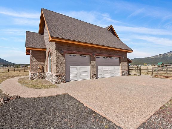 Flagstaff mountain castle was constructed as a foverer home with 8 in decorative concrete walls and trimmed in river rock. Main level features entry with leaded glass door, living room with an impressive masonry fireplace, office, bedroom and a full bath. Open kitchen with custom cabinets, granite tops, down draft cooktop in island, stainless appliance and walk-in pantry. Hardwood flooring throughout the home. Upper level primary bedroom suite with fireplace, dual closets, balcony patio with amazing view and 8.5' x 16' sitting area/nursery/exercise room. 2 additional bedrooms both with en-suite full baths. 3-car garage is 31' deep, 1200 sf and 13.5' ceiling. Heated bonus room off garage. NO HOA. There is a lot to admire in this home. See attached list of upgrades.