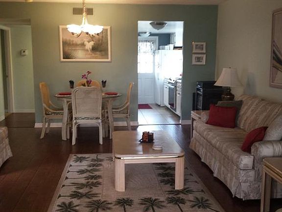 Super sized (846 sq. ft.) one bedroom unit. Completely updated and furnished. Living Room with wide plank floors, ceiling fans, flat screen TV, queensize sofabed for guests. Sliders open to tiled lanai with screens and tinted panels for chilly days. Table and Chairs in lanai extend entertaining area. Kitchen features new tile floor, dishwasher, range hood paint all done 2016. Roomy pantry closet, double sink, white cabinets. Screened porch off kitchen has storage closet which houses hot water heater. Large bedroom easily accommodates queen size bed, abundant Closet space with new doors and rollaway bed complete with sheets. Bedroom TV included.Bathroom updated in 2016 with beautiful, convenient walk in shower and new ceramic flooring. Vanity, sink and storage Above toilet updated. All windows replaced and air is 7 years old. Absolutely move in condition complete with pots, pans, utensils, dishes, bedding, towels and Furniture. Perfect for year round living, vacation getaway or investment as these Condos rent easily with minimum 1 months rental. Well maintained complex Has 2 heated pools, shuffleboard, clubhouse with free wifi, library and beautiful Kitchen plus outside gas grills. Low maintenance fees and activities. Second floor Unit is bright and breezy. Sunrise in front/sunset in back. 10/16/16