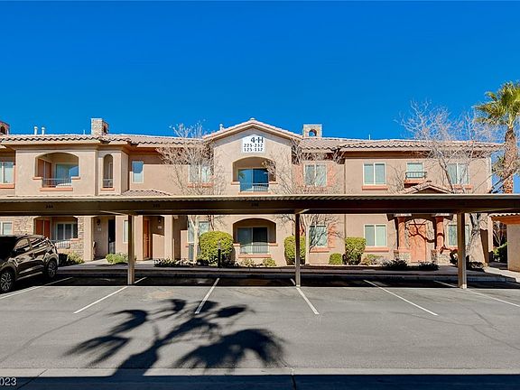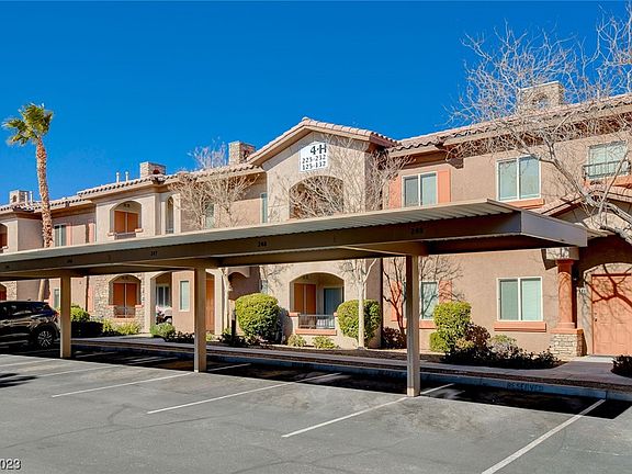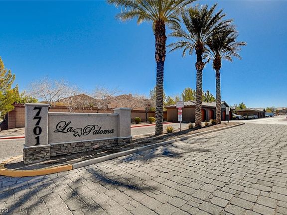 Gorgeous 2 bedroom, 2 bathroom first floor condo in the beautiful La Paloma Community in the booming Southwest Las Vegas. Upgraded unit featuring wood look tile floors, new carpet and paint, ceiling fans, shutters on all windows, security door and large patio. Heat Pump was replaced approximately 1 year ago Detached 1 car garage and assigned covered parking which is directly outside the front door. Spotless Kitchen with granite countertops, newer appliances and breakfast bar. Primary suite with large walk in closets and walk-in shower. All appliances are included! Great community amenities such as community pool, spa, exercise room, clubhouse, recreation room, jogging/walking trails, ! Just minutes from 215 freeway, hospital, shopping centers, parks, and more. Move-in ready, come see this home today!
