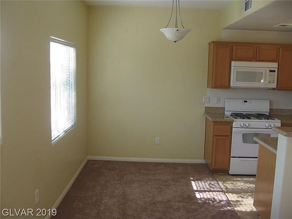 Nice second floor, 3 bedroom, corner condo. Kitchen opens up to the living room & dining room. Granite counters, breakfast bar, microwave. Plenty of cabinet & storage space. The kitchen and baths are tile, the rest is carpet. Master bedroom has a balcony. Ceiling fans throughout the condo. Well maintained, good condition. Convenient southwest location in Nevada Trails. Community pool, walking trail, exercise room. All appliance included