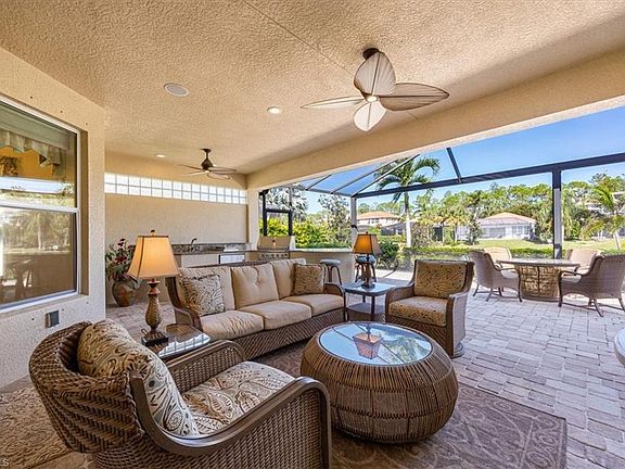 Welcome to this stunning 3-bedroom, 2-bath home, in the highly sought after community built by Toll Brothers. Step inside to find an open and bright living area with tray ceilings and crown molding. Perfect for entertaining, the open floor plan flows to the extended lanai, which is equipped with a custom outdoor kitchen with a privacy wall and a picture view window enclosure, offering breathtaking views and a seamless indoor-outdoor experience. Enjoy music from the surround sound speakers, both inside and on the lanai, creating the perfect ambiance for any occasion. The large gourmet kitchen offers beautiful wood cabinets, convenient pullouts, gleaming granite countertops, a stylish tile backsplash, and stainless steel appliances. The primary bedroom boasts beautiful hardwood floors, while tile laid on the diagonal flows seamlessly through the rest of the home. The primary and guest bedroom are outfitted with custom built-in closets, offering plenty of storage and organization. Hunter Douglas window treatments add a touch of luxury, while the thoughtful design elements throughout, including the custom finishes and built-ins, make this home truly one of a kind. Community amenities include a clubhouse with fitness room, and a resort-style pool and spa. Centrally located to historic downtown Naples, world class shopping of 5th Avenue, entertainment, restaurants and the sugar sand beaches of Naples. This home has it all!