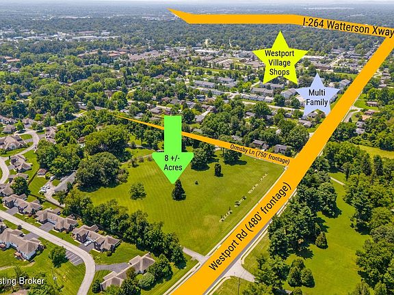 Exceptional Acreage! Extremely rare 8.02 acres of Flat and Mostly Clear infill land. Remarkable Visibility and Access: located just 1 mile from I-264 and on the edge of highly sought-after St. Matthews. Situated on one of Louisville's most traveled corridors (27k AADT), this coveted estate boasts 480' of road frontage on Westport Rd (+750' on Ormsby Ln) at a signaled light. Potential developers will benefit from established utilities and sewer connections. R-4 zoning allows 4.84 dwellings per acre, however a strong case for rezoning is feasible for higher density, mixed use or commercial opportunities. A 4,200+ sqft Ranch House with a Pool + Tennis Court currently exists in the rear that is in good, livable condition and could easily be repurposed as a clubhouse/leasing office. Within proximity to established developments such as Westport Village (retail and dining), as well as schools, mature neighborhoods, multi-family and within St. Matthews Fire District. The new $840M VA Hospital is nearby, as well as other new developments such as Bull Run Townhomes.Truly a "Once-In-A-Generation" type of property!