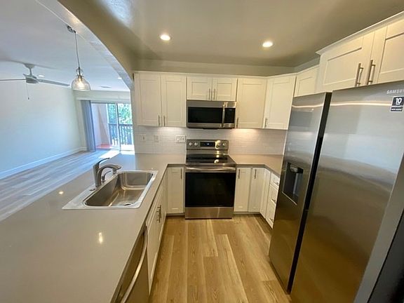 Newly renovated top to bottom! Located in gated community with pool and gym. New vinyl plank flooring throughout, bright new kitchen with white cabinets, quartz counters and stainless appliances. Two bedrooms and two bathrooms for a dual master suite setup. Balcony, fireplace, ceiling fans in all rooms. Oversized one car garage and reserved parking space. Excellent location close to schools, parks and shopping. Starbucks, 24 Hour Fitness and Vons all right across the street! Available now! No smoking please. Some pets considered.