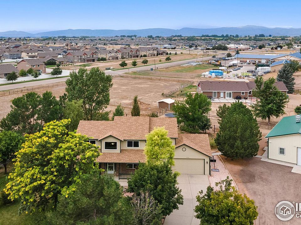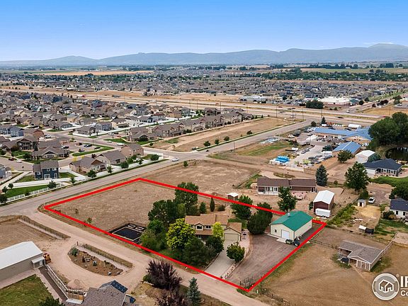 Embrace the tranquility of rural living without sacrificing modern conveniences in this charming home, situated on 1.5 acres of land with a 1,500 sq ft outbuilding and views of the Mummy Range. This property offers an idyllic setting surrounded by well-maintained landscaping, providing ample space for outdoor activities and relaxation. As you enter the home, you are greeted by high ceilings, newly refinished hardwood floors, and quality finishes throughout. The spacious interior allows everyone in the household to spread out comfortably. The family room is highlighted by a stone fireplace and wood accents, adding a warm and inviting feel to the space. Culinary enthusiasts will be delighted with the gourmet kitchen, which features a brand-new tile backsplash, high-end stainless appliances, granite counters, and ample storage solutions. Upstairs, you will find three well-appointed bedrooms, including a spacious primary suite that boasts a spa-like 5-piece ensuite bath and a walk-in closet. The finished basement expands the living area further, featuring an entertainment zone, a storage area, and a bonus room that can serve as a guest suite or a home office, adding versatility to the home. A standout feature of this property is the large outbuilding, complete with radiant floor heating, garage space, a shop area, and a commercial-grade kitchen. This space is perfect for a variety of uses, from personal hobbies to large-scale ventures. The outdoor space is designed for relaxation and enjoyment. A welcoming front porch and a back patio provide perfect spots to unwind and take in the scenic views. The yard is equipped with a drip irrigation system that extends into the fenced garden area with raised beds, perfect for those with a green thumb. Plenty of open space to accommodate horses and other animals. Conveniently located near I-25, this home provides easy access across the Front Range, making it easy to reach urban amenities whenever needed.