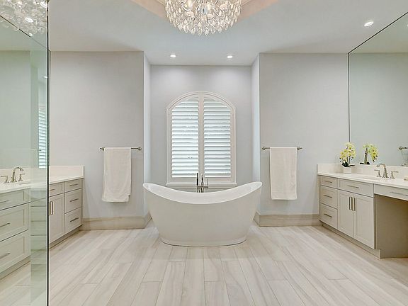 The expansive master bedroom features tray ceilings, french doors and custom built units in the walk in closets. Stunning master bathroom with chandelier, quartz counters, freestanding tub and oversized shower. Laundry room includes custom cabinetry with lots of storage and leads to the 3-car garage with epoxy flooring. Full suite of cabinetry finishes out the garage for additional storage. The main level features one guest bedroom - perfect for an in-law suite.