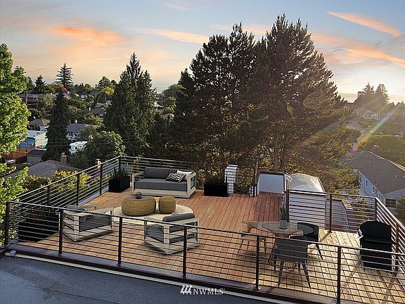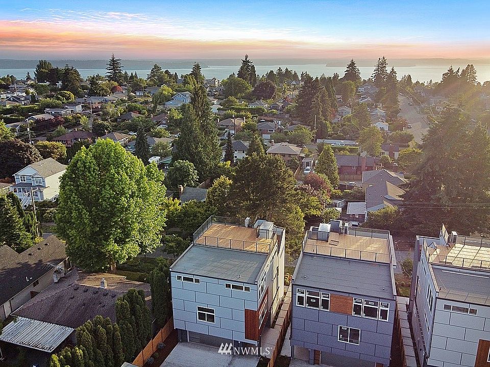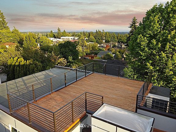 Stunning Luxury Modern Home! Generous 2,762 sf home w/ 3 beds + lower level bonus room/office. Open main level offers kitchen w/ massive island, breakfast nook, dining, & spacious living room w/ gas fireplace. Luxurious Owner Suite with spa-like bath w/ heated floors, walk-in closet & covered balcony. Designer finishes including incredible tri-level open staircase w/ skylight & LED chandelier. Rooftop deck w/ Mt. Rainier & Sound views.Rare 2 car garage! Efficient w/ central vac & AC.Solar ready!