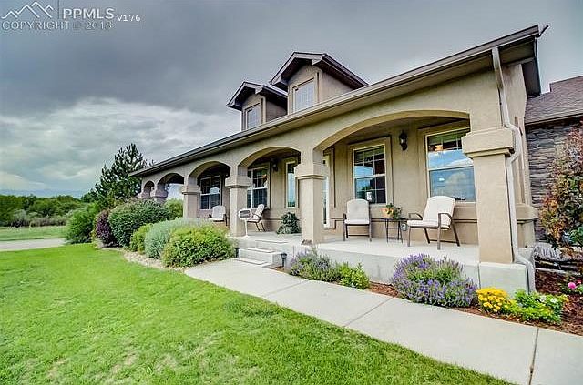 This IMMACULATE HOME is the crown jewel of this pristine Fountain Valley neighborhood...easily accessible to every amenity you'd ever want. Just minutes away from schools, grocery stores, pharmacy, hardware stores, restaurants, medical facilities and various entertainment options. Nearby is John Metcalf Park and Jimmy Camp Disc Golf Course. Fountain Valley is just minutes away from both Fort Carson & Peterson Air Force Base plus the Colorado Springs Airport is an easy 11-minute drive. This STUNNING stucco and stone ranch home sits on a 1.4-acre corner lot. Gorgeously landscaped with an inviting covered front porch and room for several seating areas. The home is bright and airy with large windows for plenty of natural light. This former Chartercraft model home has incredible upgrades throughout including soaring 10' ceilings, immaculate hickory hardwood floors, lovely knotty Alder wood doors and trim, and upgraded bronze hardware. The kitchen boasts stainless steel appliances, handsome granite counter tops, upgraded 42" Alder wood cabinets and a breakfast nook. The kitchen is open to the living room and has a cozy gas fireplace. The main level master suite has 2 walk-in closets and a 5 piece master bath. The main level also includes 2 additional bedrooms, a full and 1/2 bath, an office and the charming formal dining room with coffered ceiling. The finished basement has an additional bedroom and full bath and an immense family room with wet bar and a built-in wall unit with custom alcoves. The huge backyard is amazing and beautifully landscaped. The special play area with play set and stamped concrete patio abut an immense covered Trex deck with BREATHTAKING MOUNTAIN VIEWS! There is so much more. Schedule your showing today!