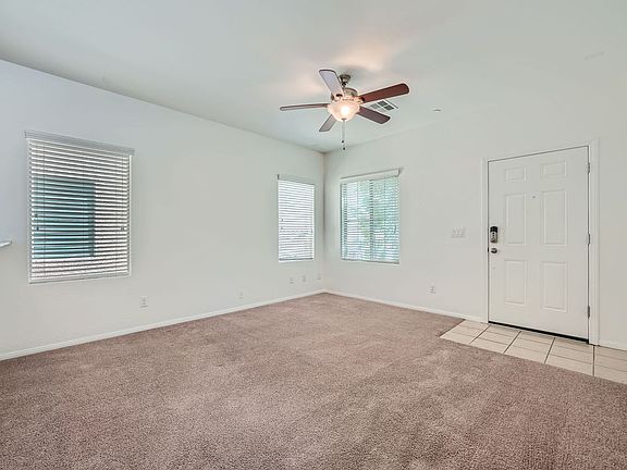 3-bedroom, 2.5-bathroom home is near shopping, parks, a community pool, and has easy highway access. The open floor plan features tile flooring in the entry, a living room with new carpet, window blinds, and a ceiling fan. The kitchen includes a breakfast bar, granite countertops, and stainless steel appliances. The dining area leads to a large front patio. Upstairs, the primary bedroom has a walk-in closet and an en-suite bathroom with a double-sink vanity, garden tub, and separate shower. The additional bedrooms have overhead lights and window blinds, with a second full bathroom nearby. The home also includes an upstairs laundry room with a washer and dryer, and a 2-car garage with direct entry. With 1,503 sq. ft. of space, this home is available now.