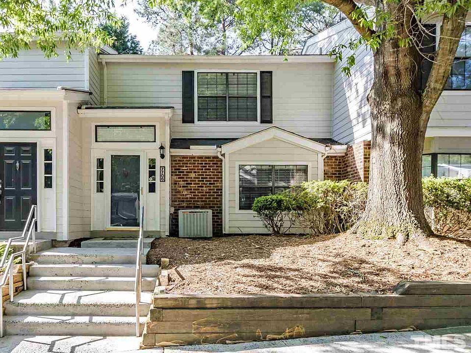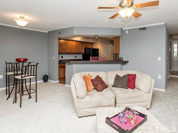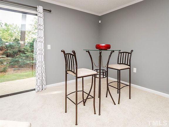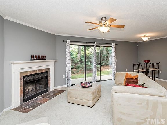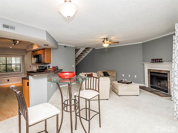Great looking condo with corner fireplace, living/dining, kitchen with sleek black appliances, updated cabinets, tons of storage, window seat. Spacious master with ensuite bath, walk-in closet. New paint and carpet. New slate fireplace surround, all new brushed nickel pulls, new blinds, curtains. Roof replaced in 2017. Community recreation includes pool, tennis, playground, Great location, walking distance to Harris Teeter, Stein Mart, Outback, Starbucks! Minutes to Crabtree Mall.