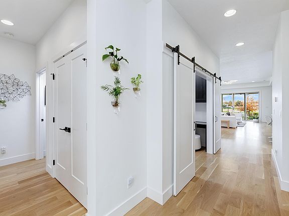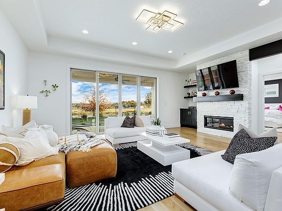 ACCEPTING BACKUP OFFERS. Rare opportunity to own this beautifully appointed, 3-bedroom, 2-bath single-level home with pond view and no back neighbors. Built by luxury homebuilder Shadow Mountain Homes. You will fall in love with the chef's kitchen with quartz counters, large island with breakfast bar, Wolf 6-burner stove and Bosch appliances. Spacious primary suite has heated tile bathroom floors, custom designed closet, walk-in tiled shower and soaking tub. Low-maintenance backyard oasis features turf and custom concrete surfaces. Covered back & side patios with sunset views, built-in speakers. Tech room has dual built-in distressed style desks and cabinets. Oversized two-car garage with epoxy floors and built-in storage cabinets and slat wall. Beautiful hickory hardwood floors throughout, extensive upgraded lighting with designer touches complete this exquisite home. Riverstone is one of Eagle's premier new gated communities featuring community pool,fitness center, club house,and sandy beach club with dock!