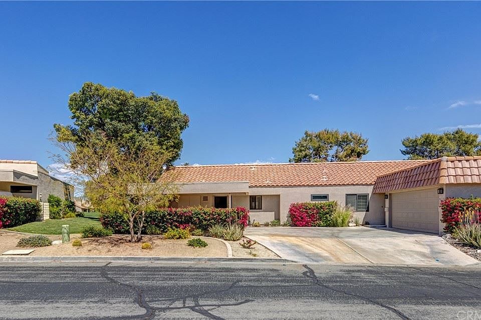 Located in Palm Desert Resort Country Club, this charming 2 bedroom/2bath home has beautiful golf course and mountain views. This home features tile flooring throughout. The kitchen features a breakfast bar and opens to the living area that has vaulted ceilings giving it a light and bright feel. Sliding glass doors lead to the patio where you can relax and watch the golfers on the 7th hole. The updated bathrooms have granite countertops, newer sinks and fixtures. The master bedroom over looks the golf course and has a slider leading to the patio. The carport is attached with washer and dryer closet. The golf cart comes with the property too!The gated community of Palm Desert Resort Country Club offers 20 salt water pools/spas, 18 hole championship golf course, driving range, pro shop, lakes, newly renovated clubhouse with restaurant, tennis courts/pickle ball courts and 24 hour gated security. This home is perfect for use as a primary residence, vacation rental or long weekend getaway! Offered Furnished.