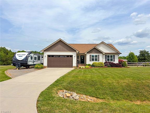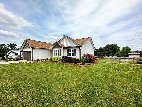 One level absolute GEM under $300K!!! 3 bedroom, 2 full bath, 2 car garage, plus space to park your RV! Absolutely charming one-level ranch-style home in Browns Summit, NC. With a .69-acre level yard, fenced for privacy, private well and septic, vinyl siding, extensive landscaping, garden space and more! This home offers convenience and charm. Inside, you'll find sparkling floors, vaulted ceilings, a kitchen island with usable cabinets, ample storage, and a separate laundry room. The covered patio-style porch overlooks the breathtaking fenced yard. Enjoy low county taxes, no HOA, and easy access to highways. Experience comfortable living in this beautiful home that combines modern features, a level yard, and a prime location.
