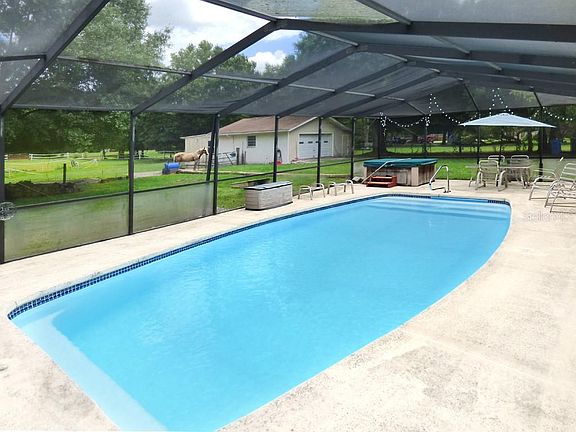 Quiet country living at its best! 2082 sq ft 4BR/2BA Pool home sits on 3.7 acres in a park-like setting on a quiet dead end street. Bring the horses and livestock! Stable, tack room and pasture with pond and creek. NO deed restrictions! NO HOA and current owner does not pay flood insurance. Wide open floor plan, perfect for entertaining. Upgraded porcelain plank tile throughout, double-pane windows, 4-door Samsung refrigerator, island stove and range. Refreshing, caged in-ground pool with spa. Double-car garage with electric door opener. Workshop and lots of storage space, plus plenty of parking for your RV.