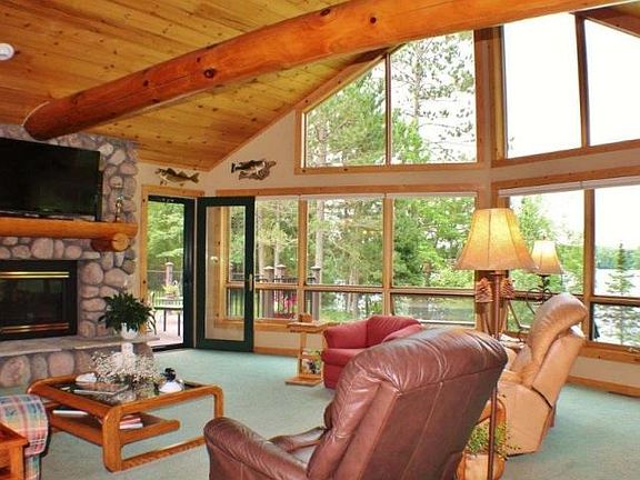 LONE PINE LAKE EXCLUSIVE! Priced well below recent appraised value. Experience Boulder Junction/Presque Isle area with unspoiled woods & waters, a nature lover's paradise and ultimate in lake living. Seclusion, 4 acres, 700' of gorgeous ftg. on Lone Pine Lake, a pristine 140 acre private watershed, 40'depths. Unsurpassed fishing & wildlife. Impressive approach to this comfortable home. Well thought floor plan, split BR, master ste, & all features one could desire. Log beamed, soaring ceilings and windows provide breathtaking lake views from almost every room. Main level features a GR boasting a floor-to-ceiling fieldstone, two-way fireplace shared with den/office, lakeside kitchen & dining. Superb lakefront sun-room has free standing stove extending the seasons. Finished, walk-out LL. Impeccable landscaping, 3 car att garage. This conservation tract has thoughtful development restrictions and an appealing blend of residences in natural surroundings.