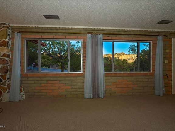 Darling Oldie and Goodie PACKED with Views! Open the Front Colored Paneled Door to find Retro Kitchen and Baths, Dining Area, 3 bedrooms with VIEWS, 2 Car Garage and ''Bonus'' - Extra Large Laundry Room and Workshop with Commode, Running Water with 2 separate entrances - which when COMBINED could be converted into a separate living quarters. Living Room Centerpiece is a Wood Burning Stone Fireplace dappled with colored rocks that serve as an accent border around home's exterior! Set on .20 with large back yard and back covered patio, on Sewer and with NO HOAS, this Slump Brick Home is situated in an area that supports high AIRBNB Rentals. It all spells Potential for that investor or home buyer wanting to get into the Hot Sedona Market in a Price Point that is quickly vanishing.