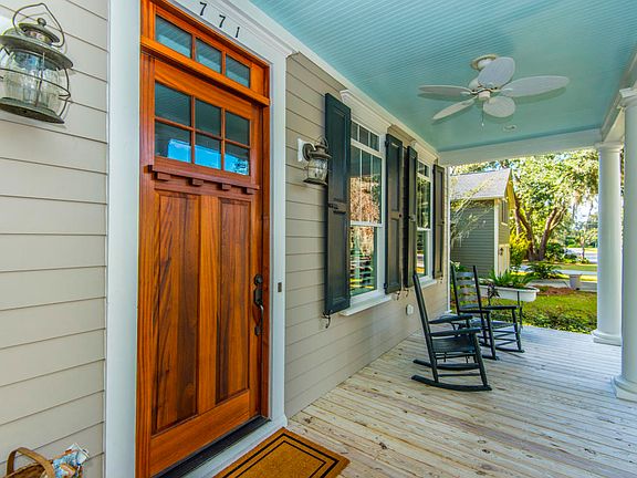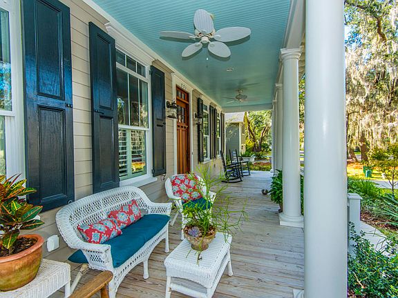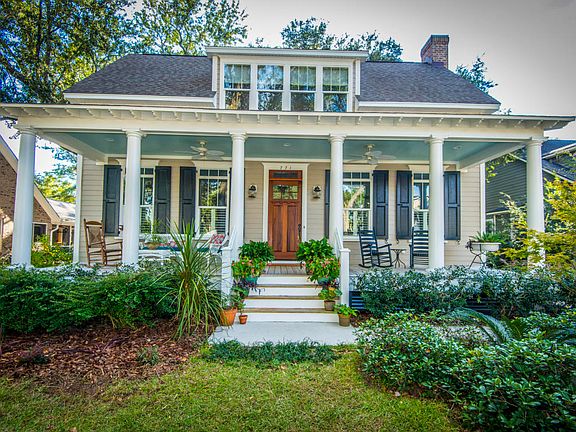 This is a must see custom-built cottage on a tree lined street in the Stiles Point district. This Southern Living home is full of custom touches flooded with natural light and has a wonderful layout and flow. The open concept is perfect for entertaining especially when coupled with the screened porch and wood burning fireplace. The floors downstairs are 5" hand scraped hickory and the ceilings range from 9' to 12' throughout the house. At the back of the home is a master cottage and ensuite with his and her vanities closets and shower heads. Upstairs are two bedrooms and a one of a kind bath with a clawfoot tub icebox vanities and barn wood door. Mature landscaping live oaks and a tabby and brick walkway complete the look of this low country cottage. House is in Flood Zone X!
