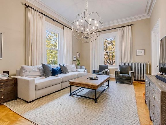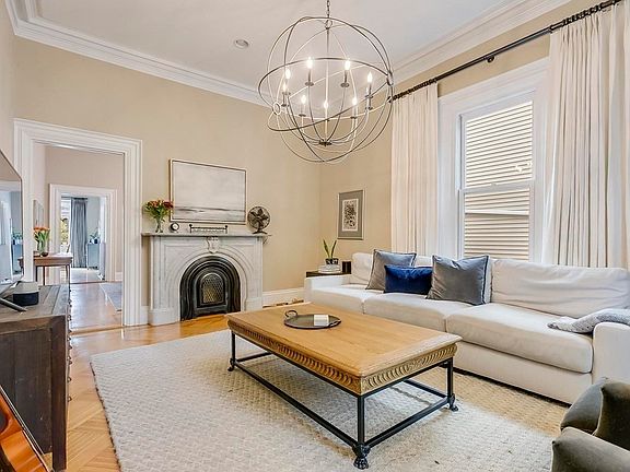 Exceptional City Point location - only steps to beautiful Independence Park!! Modern amenities meet old world charm in this highly desirable 2,300 SF bi-level unit with 2 car garage parking!! Enter through a private entrance to find stunning original detail; parquet hardwood floors with inlay, marble mantles, crown molding, tin ceilings and more. New kitchen offers stainless steel appliances & Quartz counters, wine fridge, center island & sliders to new private deck. Large stunning dining and living rooms make for fantastic entertaining space. Add'l room off the kitchen has multiple uses; office, den, playroom etc. Primary suite has a walk-in closet & direct access to a covered patio - great for rainy days! King sized 2nd bedroom w/walk in closet, queen sized 3rd bedroom. There is ample storage throughout the unit. Conveniently located to East Broadway shops and restaurants, parks & beaches, the Seaport, highway & airport access. Driveway offers easy access to garages.