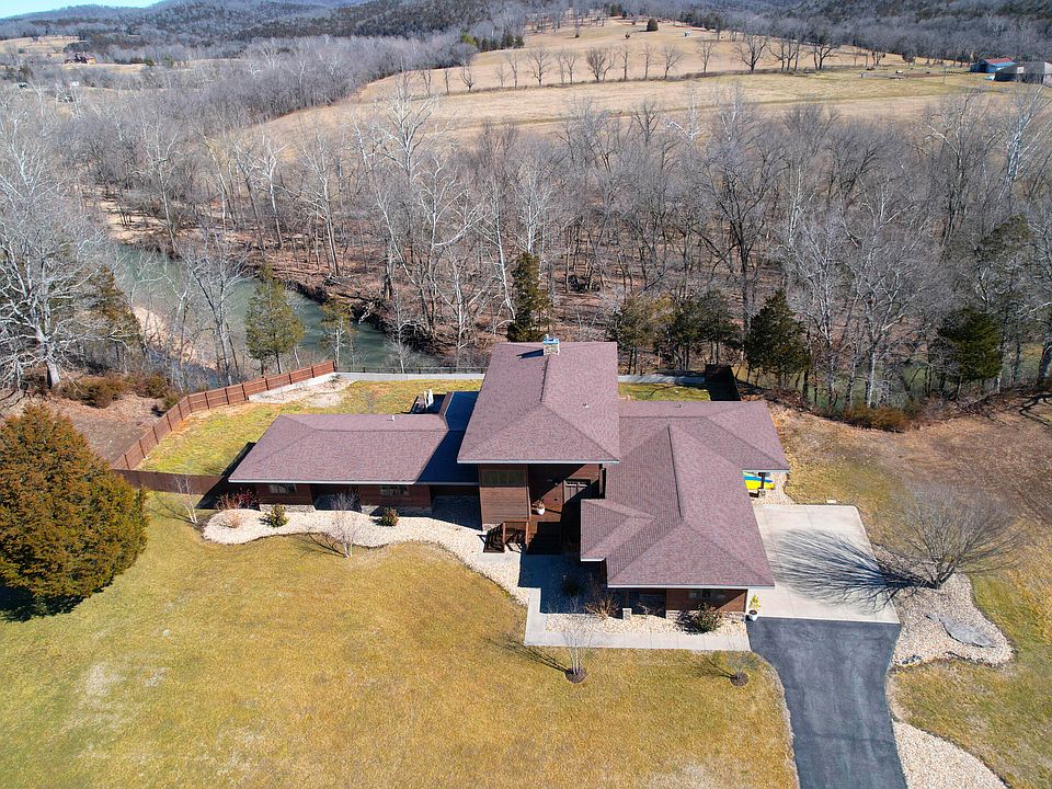 *CREEK FRONT, BRANSON SCHOOLS*Simply remarkable in so many ways! This sprawling Frank Lloyd Wright-esque home on over an acre is perched right over the sparkling waters of the spring fed, year round Bull Creek. Located in the Seven Pines gated section of Saddlebrooke, this custom built house sits on, arguably, the best lot in the entire neighborhood as it was selected by the developer for his own personal residence. Saddlebrooke is one of the premier communities in the area with it's gorgeous homes on estate-sized lots and amenities that include a pool, tennis courts, creekside parks, pavilions, and a perfect location close to Hwy 65, and just minutes from shopping, dining, golf, the lakes, and all that Branson has to offer. This home has over 5500 sq feet, yet still manages to feel warm and cozy. It features beautiful wide-plank pine wood floors--finished to perfection, a wonderfully open floorpan, and best of all: tons of windows and a backyard that looks right at the apex of the creek, making it a wonderful panorama. Ample deck space out back for entertaining, and a fully fenced yard. Lots of energy efficient features. This is one for the books! 2022-03-25