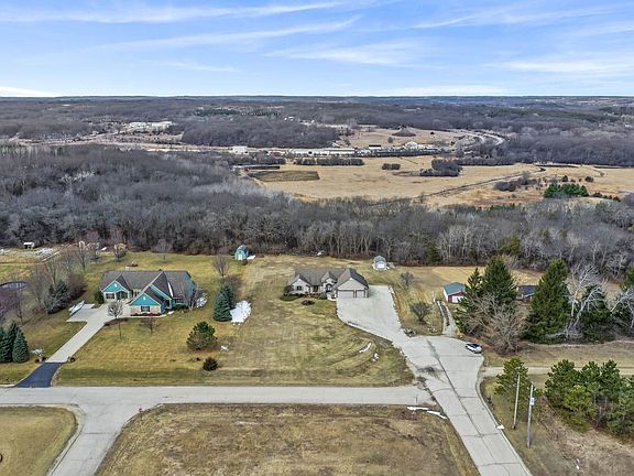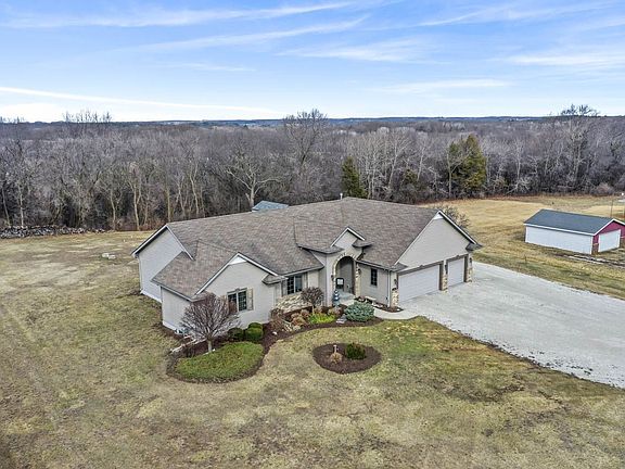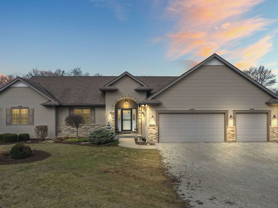 2100+sf ranch nestled on a serene 2.6 acre lot, zoned A2. Soaring ceilings & quality throughout this 1 owner, custom home. The massive living room flows seamlessly into the eat-in kitchen, featuring loads of cabinets, breakfast counter, spacious dining area, pantry & leads to huge patio & stunning back yard views. Main floor laundry is conveniently located in the mud room off of the large 3 car garage. The primary bedroom will not disappoint w/walk-in closet & large private bath. Two guest bedrooms are connected w/a full jack-n-jill bathroom. Still need more space? The huge unfinished basement is stubbed for a bath & ready to be finished. Relax outside on the custom patio or enjoy a quiet walk on your private wooded trails. Additional 1 car garage/shed for extra storage!
