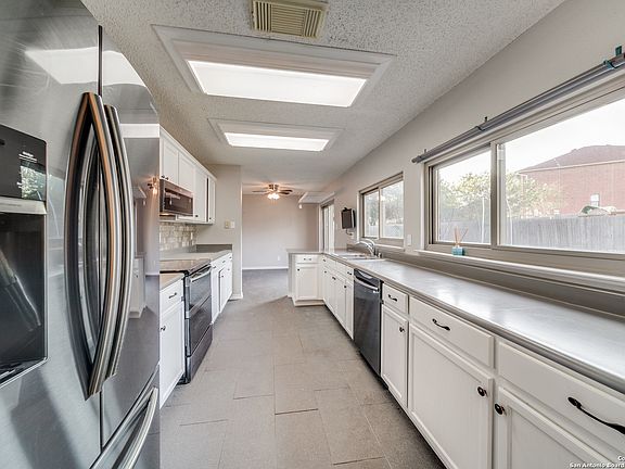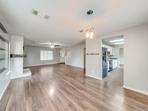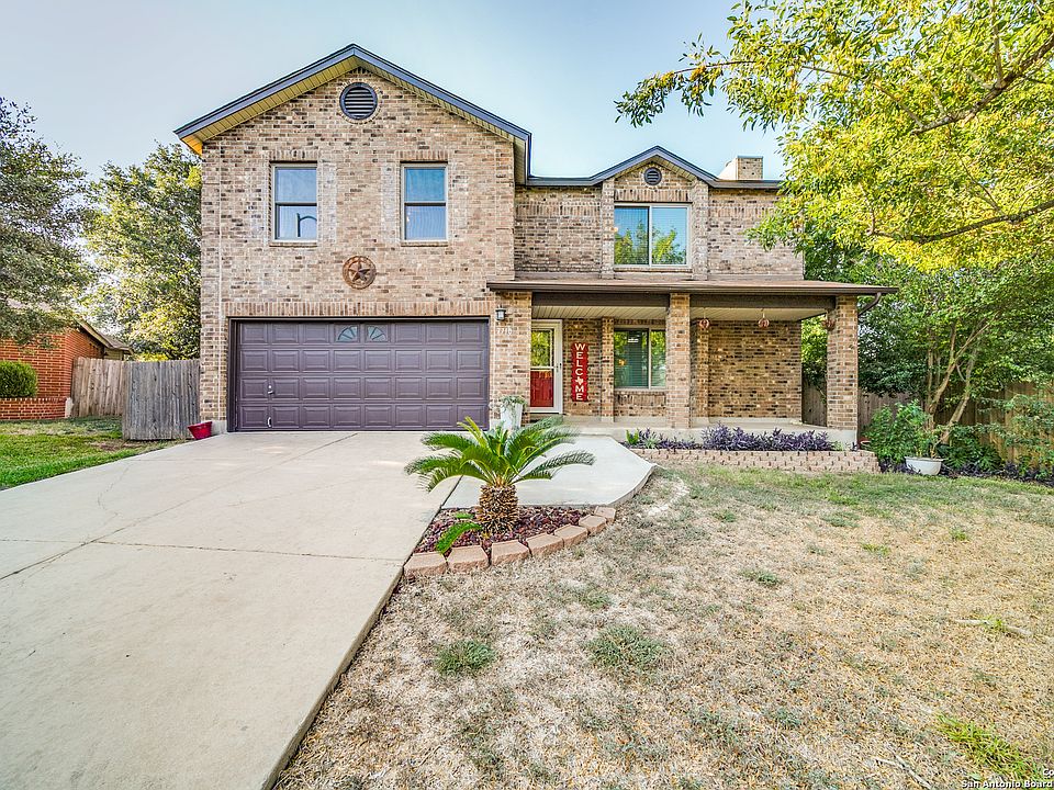 Stunning 4 bedroom 2.5 bathroom home within minutes of Randolph AFB. As soon as you enter through the custom glass door, under your cozy covered front porch, you are greeted by beautiful wood flooring, plenty of natural light and a wood burning fireplace in the heart of the living room. The kitchen comes equipped with stone backsplash and black stainless steel appliances, and overlooks the large backyard. Upstairs you will find 4 bedrooms. The grand primary suite has a double vanity, nice tub/shower combo, and an over sized walk-in closet. The secondary bedrooms all have their own walk-in closet and share a hall bathroom. The private backyard is perfect for family get togethers, and BBQ's with family, friends & neighbors. The HOA amenities include a pool with gorgeous clubhouse. Conveniently located to schools, shopping, restaurants, Randolph AFB and all attractions San Antonio has to offer. Schedule your private tour today!
