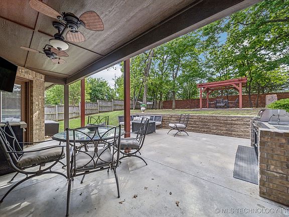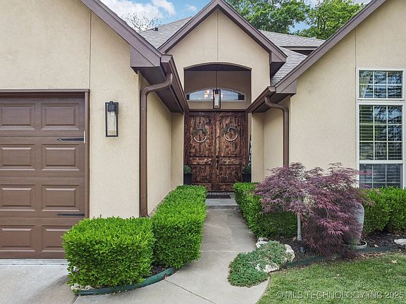Welcome to Stonebrooke in Jenks NW Schools, conveniently located behind Tulsa Hills. This stunning home features 10 ft doors that lead into a Grand Entry, with a designated office/bedroom and full bath to the right, along with a parlor/sitting room and formal dining room. The open kitchen boasts an oversized island, while the living area showcases a wall of windows overlooking the spacious backyard with an extended patio, complete with a brick retaining wall and steps. Enjoy the new outdoor kitchen (2024) featuring a grill, sink, cooler, trash storage, and a pergola - perfect for entertaining. Additional highlights include a dog run and automatic exterior lights. The upstairs gameroom comes with a pool table (stays) and a full theatre (equipment stays), leading out to a full deck for grilling or relaxing. This home offers 5 bedrooms, Master and Bedroom/Office on the main level and 3 additional Bedrooms upstairs (one currently used as a gym, which equipment does not stay). The luxurious master suite features a gas fireplace, wet bar with refrigerator, sink, and microwave, plus a spa-like bathroom with a tiled walk-in shower. This is the life.