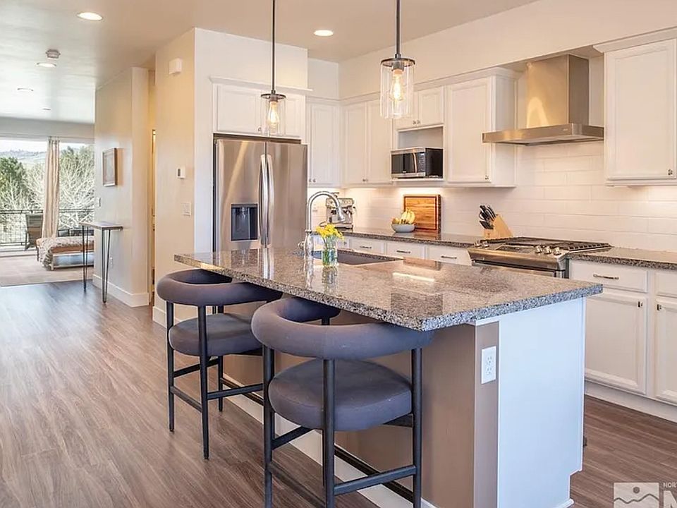 Newly built 2020 townhome in the heart of Somersett featuring high end finishes including hand troweled walls, luxury vinyl plank, dual balconies with storage closets, rod iron railings, & Alpine slider doors. The property has a beautiful view of the golf course, pond and mountains. The kitchen opens to dining nook & has custom cabinets with soft close drawers, under cabinet lighting, & stainless steel appliances. Enjoy two separate living spaces perfect for entertaining or everyday living. Private dual master rooms with walk-in closets on the top level. There are two dedicated parking spaces and a one car garage. Upgrades are offered throughout the home to meet your specific needs with five pre-wired TV locations and more. Nearby are the Somerset Town Square restaurants & shops and the Somerset clubhouse with pools and fitness activities.