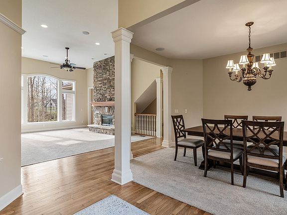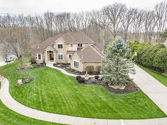 With great curb appeal and stunning views from every angle, this home has it all! A grand foyer, beautiful hardwood flooring, custom kitchen, and full finished walkout basement located on a cul de sac are noted at first glance. Primary bedroom ensuite boasts a jetted tub and new walk-in tiled shower. The home office welcomes you with custom built ins, richly toned wood shutters and a stone fireplace. Relax in the great room with soaring ceilings and floor to ceiling stone fireplace while enjoying the nature views. Gather family and friends to bread bread in this dream kitchen while staying cozy by a third stone fireplace and expansive windows. Private stairs lead to three generous sized bedrooms, one with its own private en suite. Movie night is taken to new heights in the lower level complete with 4k projector and surround sound, wet bar kitchenette, game room/home gym. Enjoy fireside evenings on the paver patio, sun on the new Trex open deck or sip in the porch, this home is perfect for all seasons inside and out with zoned heating and cooling. This gorgeous Bob Buescher custom built home in the Canyons of North Pointe Woods will surely delight. Welcome Home!