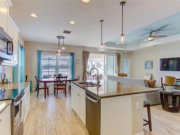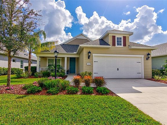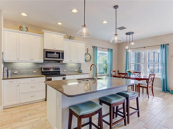 Built in 2017 with an exceptional interior design&upgrades throughout, this spacious 3 bedroom + den, 2.5 bath home on a rarely available home site is poised to take in long lake views over your sparkling pool. Enjoy easy entertaining in your open kitchen, living room&adjoining outdoor lanai. Your dream kitchen includes beautiful quartz countertops, upgraded appliances such as an induction stove top&slate French door refrigerator, an extra Butler's pantry/bar area, designer pendant lighting and all-wood soft close pot/pan drawers with under cabinet lighting - all surrounding a large center island with double sink. Open the triple pane sliding doors & let the Florida lifestyle take the lead as you enjoy seamless indoor/outdoor living with magical views of the grand lake, expansive outdoor area and salt water heated pool with sun-shelf. Retreat to the large master suite complete with door to lanai, spacious walk-in closet, dual sinks, and large shower. Additional upgrades include:coffered ceiling,wood plank tile,designer lighting,French doors on den,2ft garage extension, TV prewire on lanai,upgraded pool surface & added energy efficient features - see complete list attached. The Ridge at Crossing Creek is a gated community celebrated for its 21 acre lake with kayaking permitted&community kayak storage,wooded preserves,wildlife,resort-style pool/spa,cabana & outdoor kitchen. All of this for a low HOA and No CDD fee. With a gorgeous lake view like this, you will want to hurry and schedule your showing today!