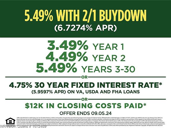 OFFERING A 5.49% INTEREST RATE 2/1 BUYDOWN (3.49% year 1, 4.49% year 2, and 5.49% years 3-30), 4.75% FIXED INTEREST RATE ON VA, USDA,AND FHA LOANS, OR $12,000 TOWARDS CLOSING COSTS and/or APPROVED OPTIONS THROUGH 9/5/24 @6:00PM OR UNTIL FUNDS RUN OUT WHEN USING PREFERRED LENDER!!!!
