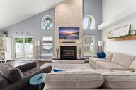 Grassy lawnSpacious guest bedroomsShimmering pearl backsplashCabinetry with crown moldingPaver patioOpen-concept layoutSoaring vaulted ceilings