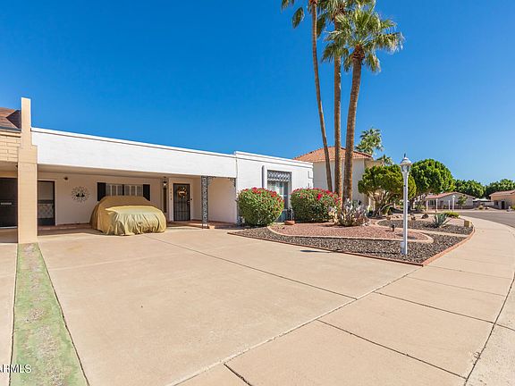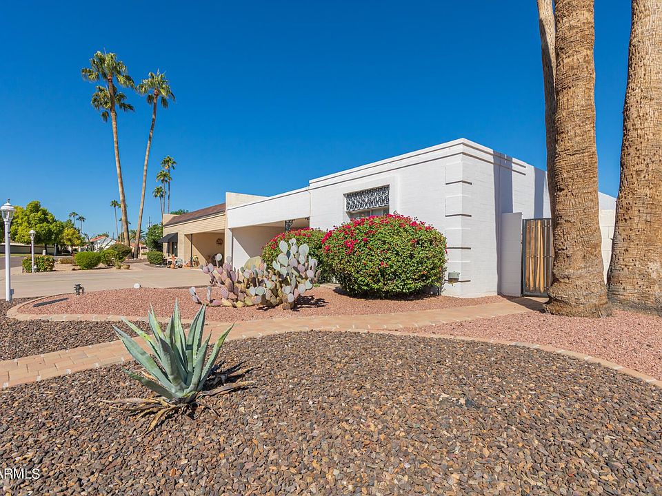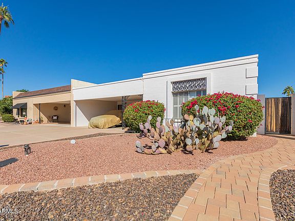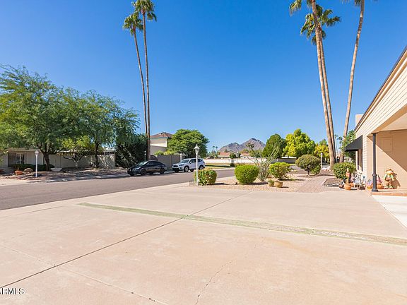 Pristine Villa Monterey ** 55+ Community ** Historic Designation ** Desirable single level end unit w/side gate ** Coveted location near pool ** Double carport ** 1/2 mile to Chaparral Lake & Park ** Very close to Fashion Square Mall, Old Town, Waterfront ** Remodeled kitchen features maple cabinets, granite counters & backsplash, updated appliances, skylight, in-ceiling lighting, breakfast nook, side hutch w/matching granite ** Spacious, Travertine tiled living room, formal dining ** 1578 sq. ft. of living space PLUS 300 sq. ft. Arizona/Hobby room ** Some furniture available ** Principal bedroom suite features plantation shutters, remodeled bath and 3 closets ** Large second bedroom ** Hall linen & coat closets ** Both bathrooms (principal & hall bath)