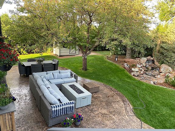 This lush yard is calling you! The yard is sheltered by huge trees and has a waterfall / stream, stamped patio, raised deck and a second stamped patio under pine trees (we call it a tree-zebo). Fresh paint inside and out and a new roof. The unique tri-level design creates an open, vaulted area between the kitchen/dining area and the ground floor living room. The upper floor has 3 bedrooms and two bathrooms. The garden level has a family room, bedroom, bath and laundry room. There is also unique storage area of 360 square feet. Location, location, location! On 2 acres just north of Mustang Ridge and only 2 miles from Frontier Mall and Dell Range shopping. 95 mature trees with a mix of spruce, ponderosa pine, aspen and flowering crabapple. Raised garden beds for flowers or vegetables, all sprinklered. Our kids loved the play gym and playhouse in the back yard. 10’ x 16’ shed, 7’x 8’ shed, and a 10’ x 12’ greenhouse.