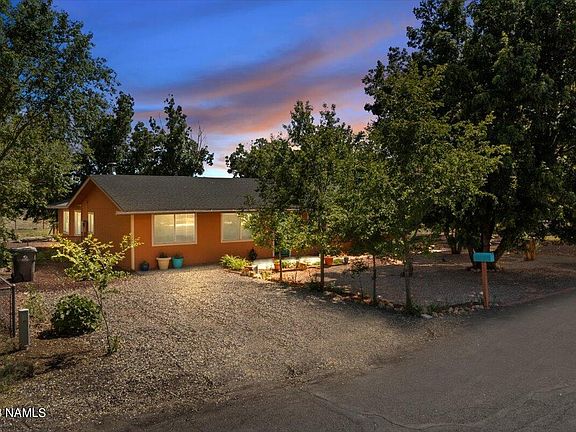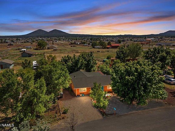 There are three big outbuildings, two are for storage; the third open one is the family patio for those cool backyard BBQ's and family get togethers. Imagine evening family dinners and family game time on that patio. At night you can see the Milky Way and millions of stars. Deer often visit the back yard and humming birds love the flowers. Drip system makes watering the lovely plants easy. Evap cooler makes keeping cool inexpensive, too. Ceiling fans in almost every room and new (2023) programmable thermostat keep temps perfect in all seasons. The yard is fully fenced with the back half acre separated from the front half acre. Lots of room for the kids to play; all within sight of the family room and patio. Beautiful trees, nice, safe, quiet neighborhood, room for visiting relatives to park their RV and plug it in, too; all close to Flagstaff amenities. NO HOA! This home is ideal for large families. This is a hot market, homes are selling fast and school starts this month! Make this your perfect family home at a great price!