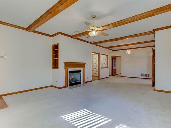 Largest unit in desirable Feather Cove 55+ community. 2 bed 2 bath 2 car garage unit, original model home. Upgrades include gas log fireplace, built-in bookcases, French doors, in-unit laundry, crown molding, upgraded woodwork, sunroom plus glass enclosed porch and 10x20 patio. Formal dining plus breakfast area in kitchen. New roof and new refrigerator and dishwasher. Tankless water heater and hardwired security system.
