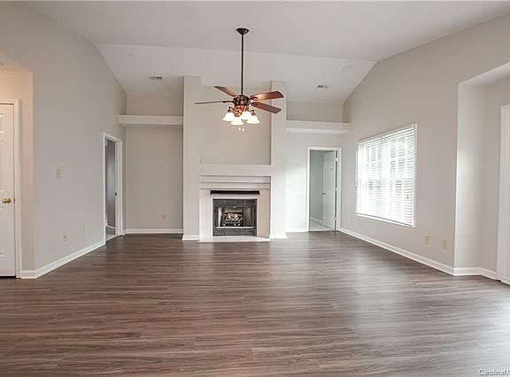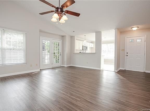 Cute as can be cottage style home. Total makeover with new wide plank flooring and carpet, new and never used stainless steel appliances, granite, new bathroom vanities, updated lighting, and whole house interior paint. Updated HVAC and water heater. Dramatic vaulted and open layout with lots of natural light. One story, no stairs. Private courtyard patio and a nice level lot with fenced yard backing up to trees and unbuildable county greenway. Storage buildings will hold all your yard tools. Super low HOA dues makes this home more affordable. So convenient, near I-485 and I-77, grocery store around the corner, and near lots of shopping and restaurants. Central location with many different options to commute to the Airport, Charlotte, Huntersville, Concord, and Mt Holly. Near Mountain Island Lake boat ramp and Latta nature preserve walking trails.