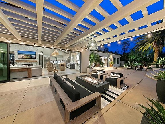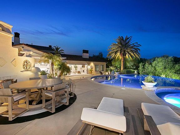 Welcome to the California modern masterpiece that caters to luxury-seeking buyers. Located in the exclusive Cielo community on a scenic hilltop in Rancho Santa Fe and the Pacific Coast, this property is a vision of indulgence, with five bedrooms and six baths. As you explore the expansive estate, the grand foyer beckons with high ceilings and impeccable finishes. The outstanding Walker Zanger Tile backsplash and Infinity Quartzite countertops are just the start of the luxurious interiors. The two vanishing 24’ breakaway pocket door walls in the dining and living room offer the perfect indoor/outdoor experience while taking in breathtaking views of the stunning Rancho Santa Fe hills. Moreover, the estate is equipped with a state-of-the-art Savant media and A/V system, a perfect blend of luxury and technology. The gourmet kitchen incorporates the highest quality Miele coffee systems, Wolf range, speed and convection ovens, and a Zip HydroTap Water System along with an exquisite bamboo kitchen sink. Luxury takes centerstage with the delightful European Oak floors and ambient light-capturing brand new Pella windows along with the new shading window coverings. The exterior lighting system by Lighting Distinctions amps up luxury with perfection. Don't miss a unique wine tour experience in the amazing 800-bottle 2 walk-in wine fridge, featuring an intelligent Winestation dispensing system. Car enthusiasts can celebrate and preserve their sterling possessions with the impressive four-car garage including an EV charger. Upgrade Your Stay with a Detached Casita - Enjoy an added bed and bath, plus a cozy fireplace just outside the door, in the detached casita's plush living quarters, indulging you with sprawling living space. Move outside, and an exotic outdoor space awaits you, with ample seating capacity, dual fire pits, upscale infinity pool, and captivating landscape scenery that makes any gathering unforgettable. Boasting an unrivaled location in the highly-coveted Cielo community, with 24/7 guard-gated security, state-of-the-art fitness center, clubhouse, swimming pool, tennis, and pickleball courts, it is no wonder this Cielo community is a must-have for the elite in Rancho Santa Fe. Located conveniently and just minutes away from world-class lifestyle amenities and multiple dining options, 5-star resorts, top-rated Rancho Santa Fe schools, and award-winning restaurants. This dreamy Californian estate epitomizes modern living, brimming with luxury, located in a prestigious community, and exceeding every conceivable expectation. Surrender to opulence at its finest, delight in comfortable Southern California living, and pristine design- this marvel is a dream come true and an absolute must-see in person!