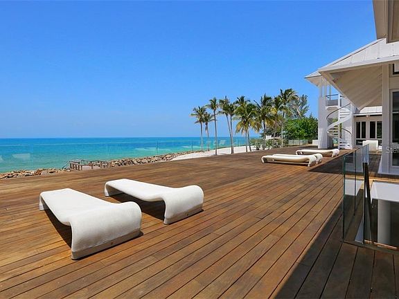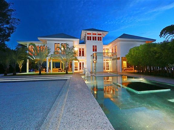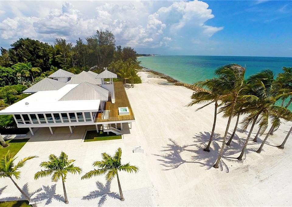 Offering one of the area's most coveted lifestyles, this tropical sanctuary, known as Aquadisia, consists of almost 4 acres on the Gulf of Mexico in the coveted Sanderling Club on Siesta Key. With 528 feet of direct beachfront, one of the most significant on the entire Gulf Coast, this estate exudes privacy, tranquility, and relaxation from the moment one enters the amazing grounds. Meticulously renovated, paying tribute to the original Guy Peterson structure and the majestic site, Aquadisia is a stunning modern muse. The sophisticated use of glass, water, quartz, hardwood, and shell stonework together to create a modern, warm and refined beach residence. Extensive planning and attention to detail have resulted in mesmerizing grounds including a grove of Royal palms, a reflecting pool and a labyrinth surrounded by exotic bamboo. The culmination is the perfect backdrop for indulgent relaxation or lavish entertaining both inside and out. There are also many opportunities for expansion of the existing home or construction of a second home creating perhaps one of the most significant compounds in all of Florida. This property is truly extraordinary on its own, but as part of the Sanderling Club, it offers a guard gated entrance, beach clubhouse, tennis courts, beach cabanas, playground and dockage on the bayside of the island. Total square footage, bedroom and bathroom count includes additional parcel known as the "Pool House" located at 7711 Sanderling Road with 150 feet of water frontage on Heron Lagoon.