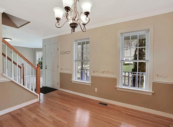 Lovely vinyl-sided transitional features 2 car garage and paved drive. Enjoy the outdoors from your front porch or rear deck (which overlooks wooded, level back yard.) Large Great Room has gas fireplace and bay window. Dining Room with hardwood floor. Spacious eat-in Kitchen has Silestone Counters and huge breakfast area with bay window. Huge Master Bedroom with sitting area w/bay window, and walk-in closet with closet organizers. Spa-like Master Bath with separate tub and shower. Three additional bedrooms and full bath to round out the second level. Five Forks is a community w/ a pool, tennis courts, clubhouse, and play-area. Also, convenient to commuter routes (288, 76, 10 & 95).