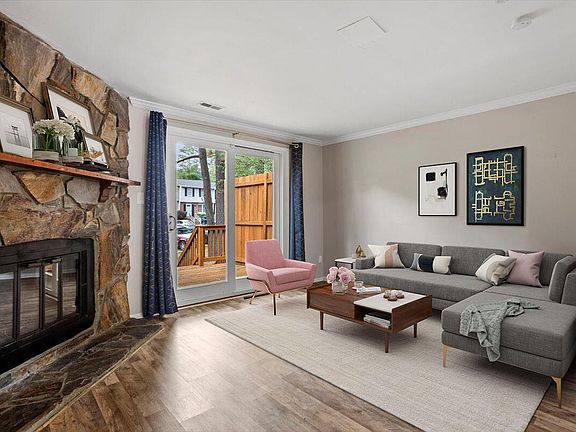 Welcome to this centrally located 2-bedroom, 1.5-bath townhome in the desirable Crown Oaks community. Featuring nearly 1,000 sq ft, this home shines with LVP flooring throughout (carpet on stairs), smooth ceilings, and a bright open living room highlighted by a cozy stone fireplace. The kitchen boasts newer stainless steel appliances (2022), complemented by a new sliding door (2024) leading to a freshly stained deck. Bathrooms have been completely refreshed—the powder room with a new toilet and vanity, and the full bath with a new vanity, shower, and toilet. Additional updates include a new front door, four replaced windows, and mechanical peace of mind with a new AC (2024. Enjoy a private deck perfect for entertaining along with the community amenities such as a pool, tennis courts, and common areas. Conveniently located near I-540, Six Forks Road, shopping, dining, and downtown Raleigh, this move-in ready home is a perfect blend of comfort, updates, and location!