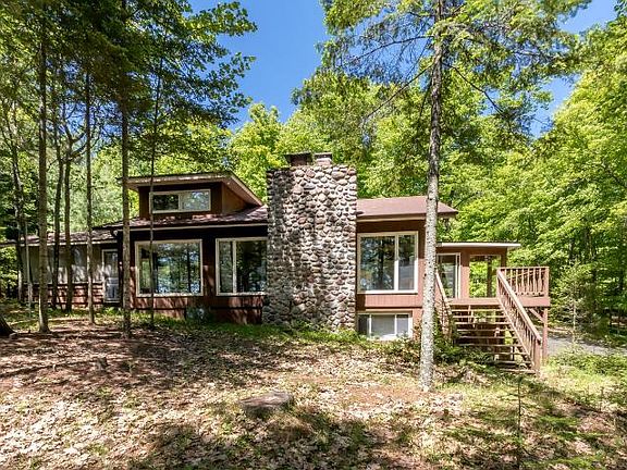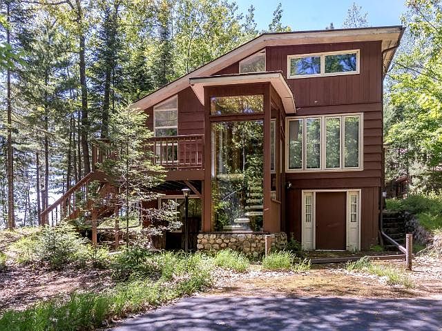 Unique design 4 bedroom, 2.5 bath home on Minocqua Chain of lakes. Beautiful southern lake views w/ 200' of sand frontage on Tomahawk Lake. Two story glass entry offers incredible views in 3 directions. Main floor and upper level provide 4 bedrooms, 2 baths, spacious kitchen & living room, and wonderful lakeside sundeck. Lower level features a sauna, rec room w/ wet bar, laundry room, half bath, and workshop area. A studio guest house w/ kitchenette (not on septic system), 2 car detached garage & 1 car detached garage w/ loft are also included with this unique property. Additional amenities include a built in security system, Aqualand pier, an electronic chairlift to the lake, lakefront storage shed, & shared blacktop driveway. Property has been in the same family for nearly 40 years. Owners regretfully must pass it on for another family to enjoy. Don't miss this opportunity!