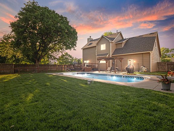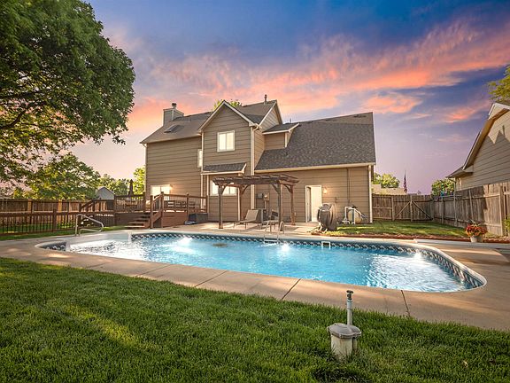 Welcome to your own private oasis! This beautiful 4-BEDROOM, 3.5-BATHROOM home offers everything you could want—space, style, and summer-ready outdoor living—all nestled within the highly desirable MAIZE SCHOOL DISTRICT. Situated next to Barrington Park, a charming neighborhood park with a playground, picnic tables, and an open field, this property feels like it has a bonus backyard. Step into your own serene retreat with a lush, well-maintained lawn supported by a brand-new sprinkler system on an irrigation well. The crown jewel of the backyard is the luxurious IN-GROUND SWIMMING POOL, recently upgraded with a new liner, cover, pump, and filter. A robotic skimmer and vacuum are included, making maintenance a breeze—just in time for poolside fun this Kansas summer! Enjoy the outdoors from the comfort of a two-tiered deck and cabana-style covered patio, all shaded by mature trees and perfect for relaxing or entertaining. Inside, you’re welcomed by an inviting living room filled with natural light. Recently installed energy-efficient vinyl windows and patio doors with decorative grilles enhance both comfort and style. Rich wood laminate flooring flows throughout the main level into a modern kitchen featuring granite countertops, newer stainless steel appliances, a coffee bar, a handy pantry, a cozy breakfast nook, and a window over the sink offering picturesque views of the backyard—perfect for keeping an eye on poolside activities. A convenient half bath just off the garage entrance is ideal for guests enjoying the pool. The spacious dining room offers an elegant setting for family meals or entertaining friends. Upstairs, the grand primary suite boasts vaulted ceilings, a walk-in closet, and a beautifully updated en-suite bathroom with granite tile and a double vanity. Two additional bedrooms, a full hall bath, and a versatile bonus room with laundry hookups provide plenty of flexible space for a home office, game room, or potential 5th bedroom. The finished basement includes a large family room perfect for movie nights, a 4th bedroom with its own full bath, and a generous storage/utility room. Barrington Place is a delightful NW Wichita neighborhood offering convenient access to Sedgwick County Zoo and Park, movie theaters, All Start Sports Amusement Park and so many other shopping and dining options. Call to see your next home today!